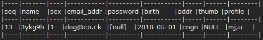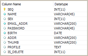 SELECT SEQ, NAME, SEX, EMAIL_ADDR, PASSWORD, BIRTH, ADDR, THUMB, PROFILE