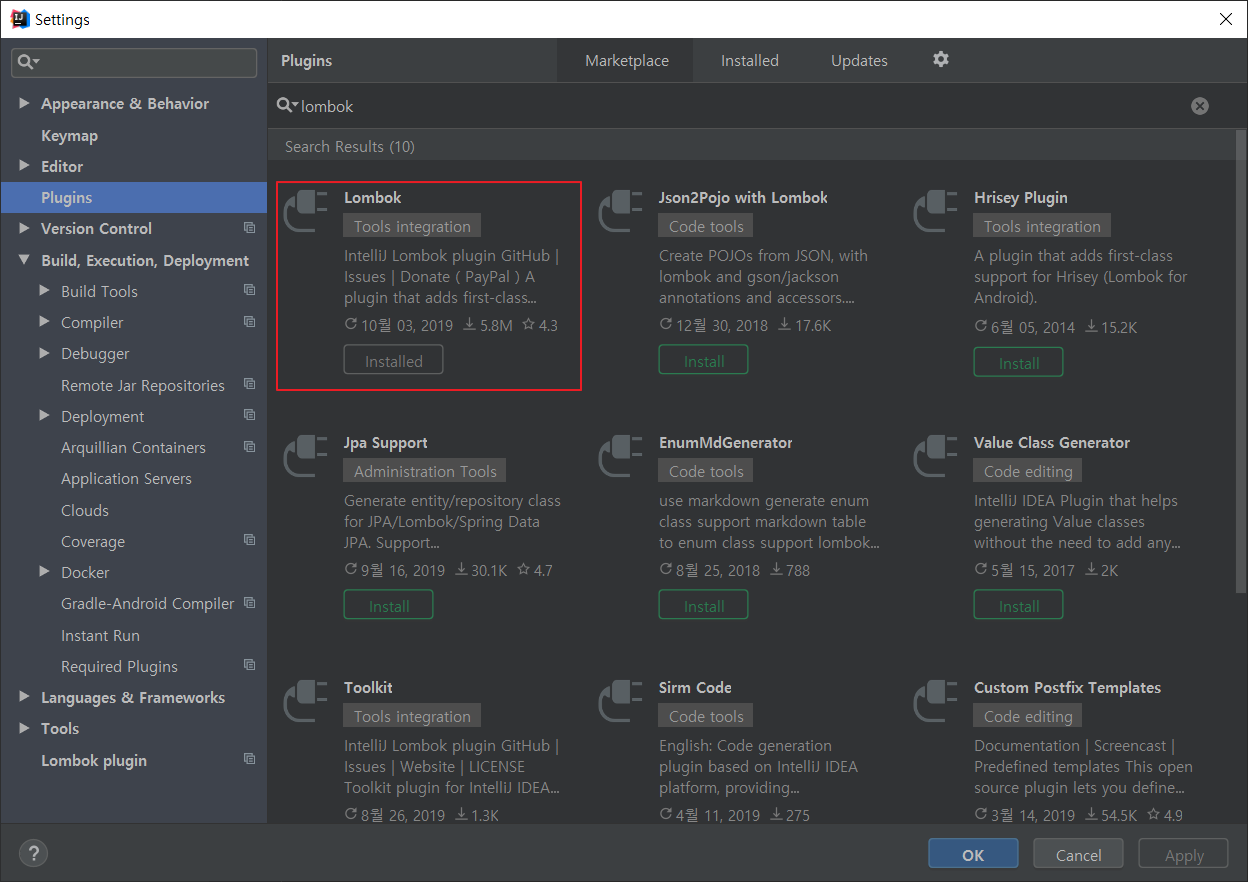 1. File Setting -> Plugins 에서 lombok을 검색하여 설치 후 Intellij 재시작