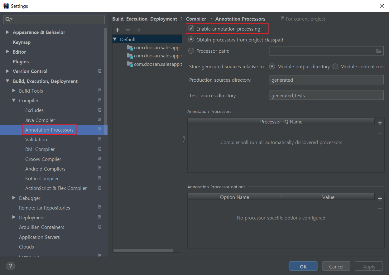 2) Compiler => Annontation Processors의 'Enable annotation processing' 체크