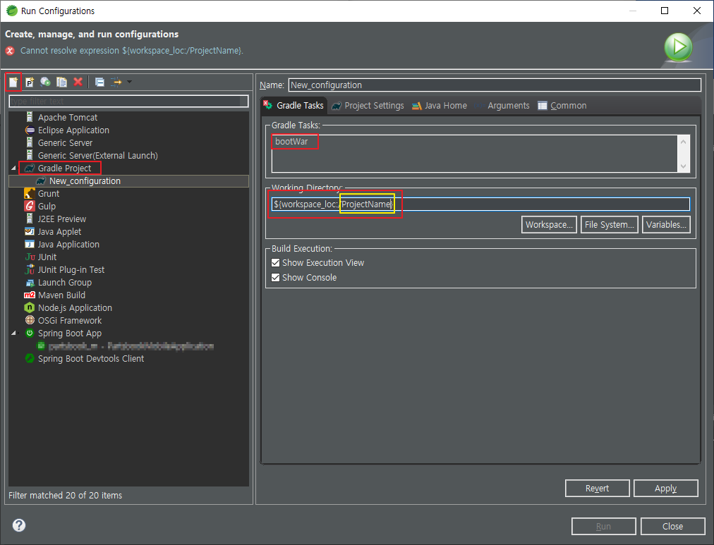 3. 새 환경의 Gradle Tasks에 'bootWar' 입력 -> Working Directory에 '${workspace_loc:/